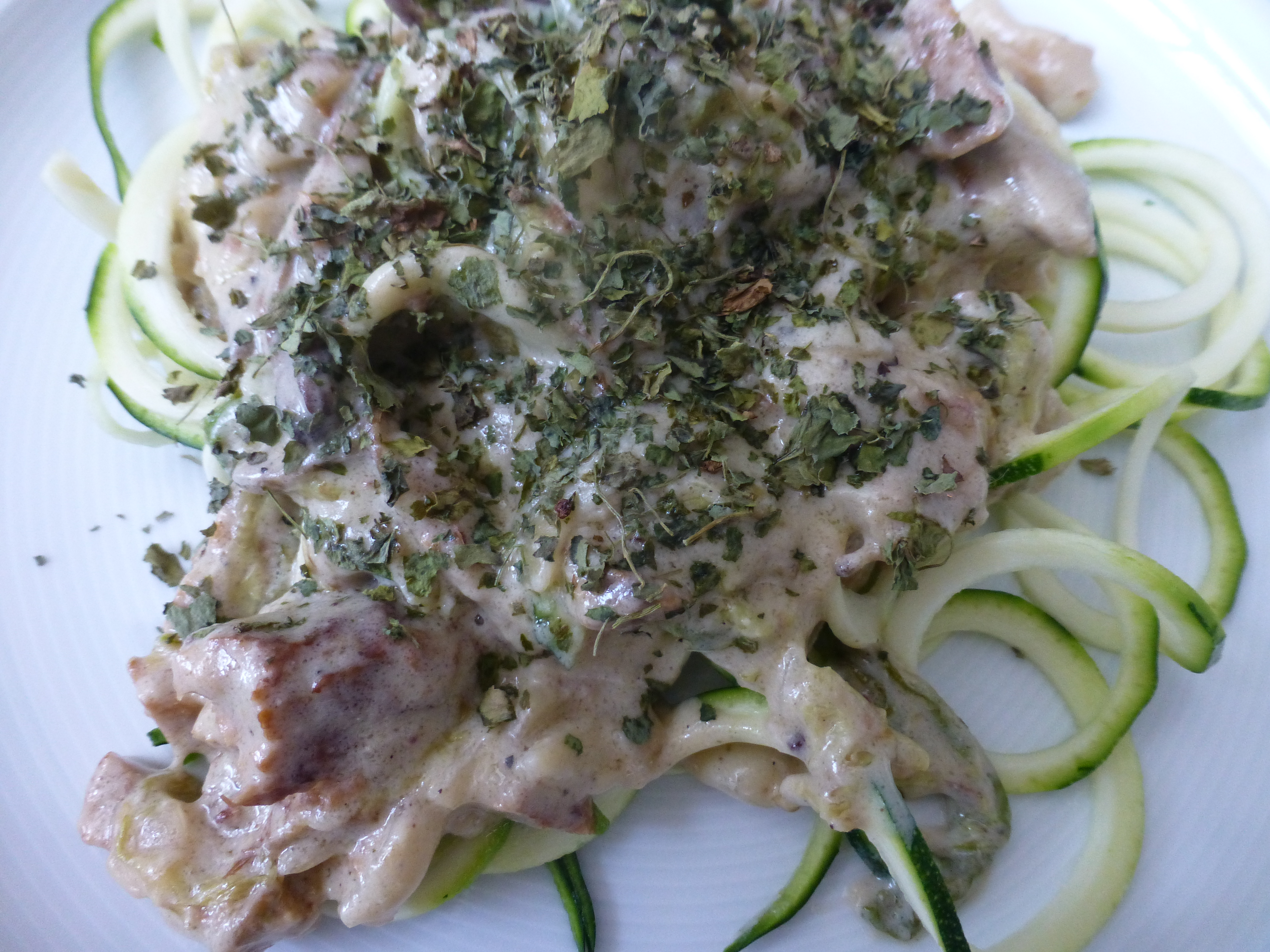 1 große Zwiebel, 50g Austernpilze, eine Hand voll Chicoree in Streifen, 100g geräucherter Tofu oder Seitan, Salz, schwarzer Pfeffer aus der Mühle, getrockneter Bockshornklee oder frische Keimlinge, 2EL Kokosöl, 2 mittelgroße Zucchini, Saft 1/2 Zitrone, 4EL Mandelmus, 450 – 500 ml Wasser (nach Konsistenzwunsch).