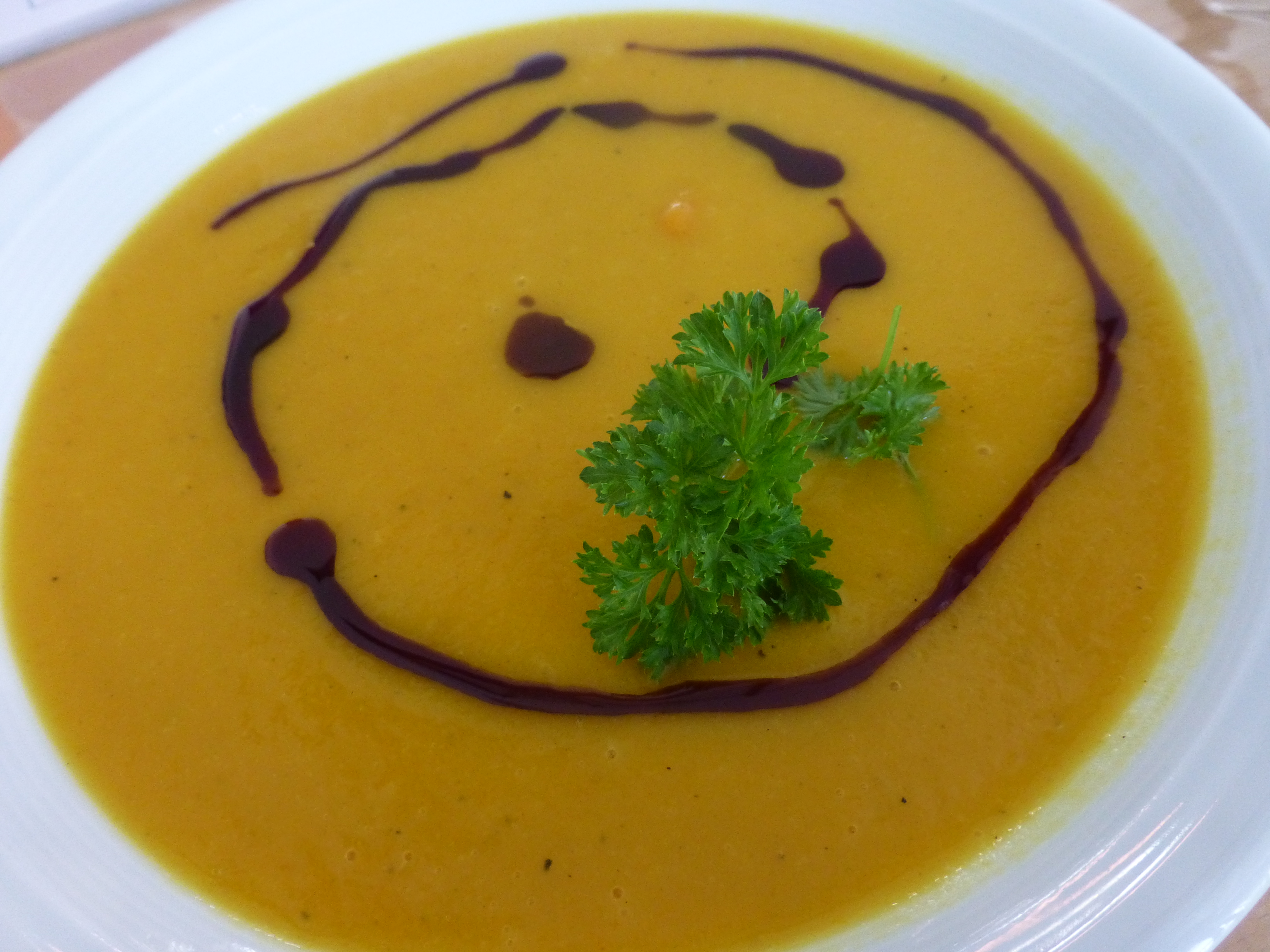 Die Zwiebeln in Würfel schneiden und mit dem Curry in dem Öl glasig dünsten. Süßkartoffeln und Äpfel in ebenfalls kleinen Würfeln, Möhren in dünnen Scheiben mit der Gemüsebrühe dazugeben und ca. 15-20 Minuten köcheln lassen (bis das Gemüse gut weich ist). Danach alles pürieren und mit Salz abschmecken. Mit etwas Kürbiskernöl, Zimt und einem Stiel Petersilie servieren.