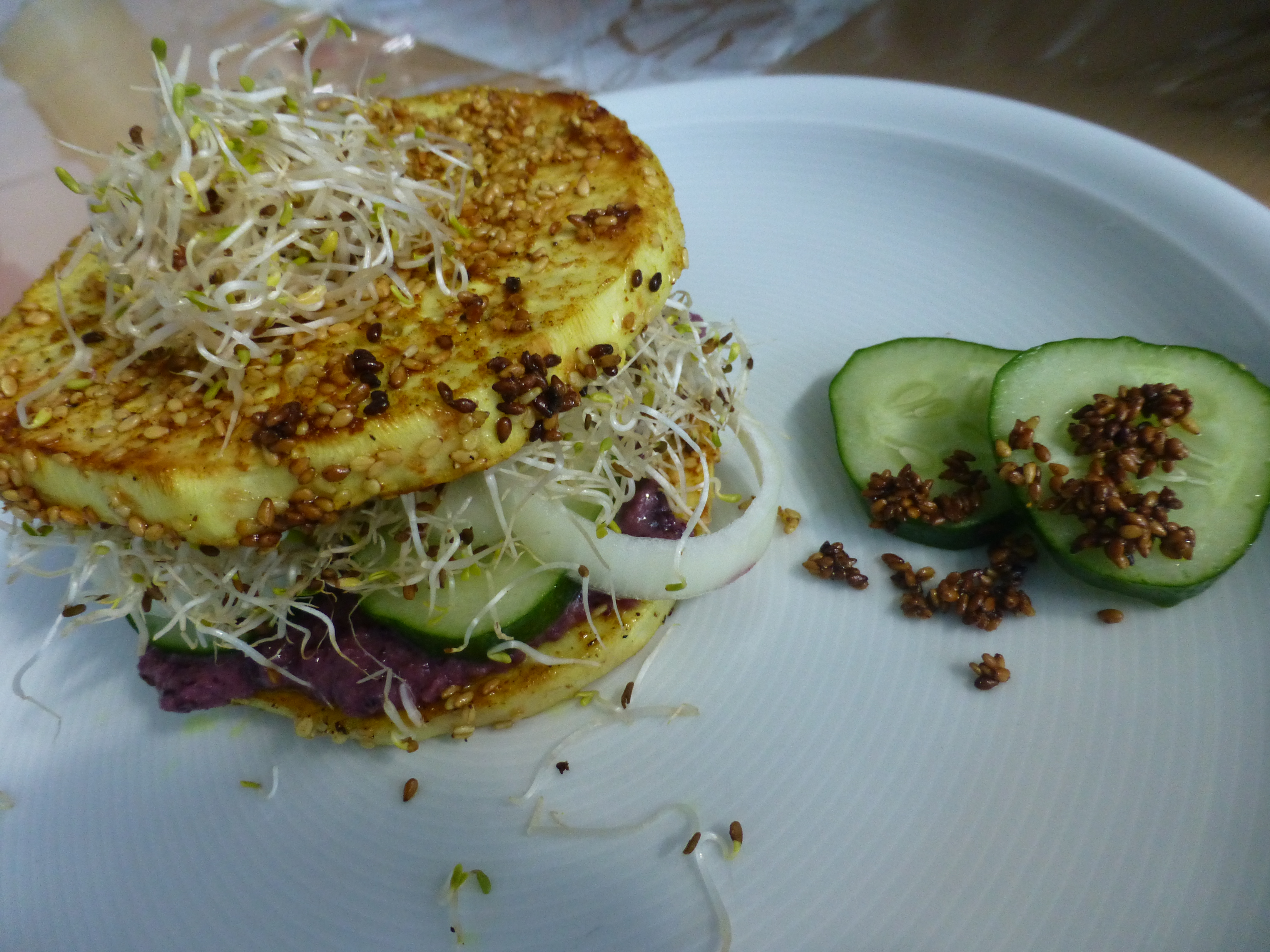1) Die Sellerieknolle dünsten bis sie schnittfest ist. Abkühlen lassen und in fingerdicke Scheiben schneiden. 2) Das Kokosöl in einer Pfanne erhitzen, die Scheiben abwechselnd in Haferdrink und Sesam eintauchen. Die Scheiben in die nicht zu heiße Pfanne geben, mit Pfeffer, Salz und Kurkuma würzen und auf beiden Seiten kurz anbraten. Herausnehmen und abkühlen lassen. 3) Sellerie Scheibe auf den Teller legen, mit Aufstrich nach Belieben (entweder selbstgemacht oder gekauft, eher süßlich oder eher würzig) bestreichen. Gurke in Scheiben und Zwiebel in Ringe schneiden und diese ebenfalls auf den Aufstrich legen. Dann von den Sprossen und etwas Rucola obendrauf, zweite Scheibe Sellerie als „Deckel“ ……..
